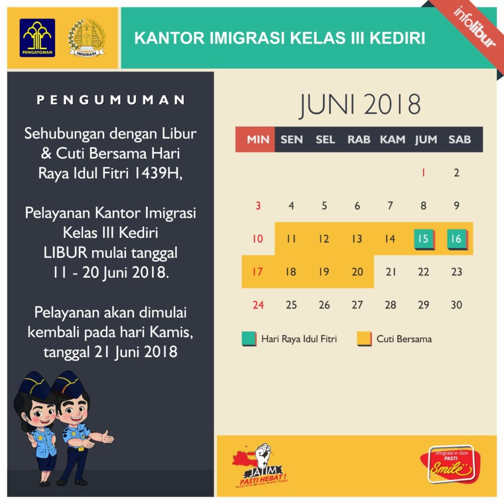 Lebaran sebentar lagi, saatnya mudik dan berkumpul dengan sanak famili. Pelayanan Keimigrasian di Kantor Imigrasi Kediri tutup mulai 11 Juni s/d 20 Juni 2018 dan akan mulai aktif kembali pada hari Kamis 21 Juni 2018. Untuk pendaftaran antrian via wa akan mulai di buka pada hari Rabu tanggal 20 Juni 2018. Demikian disampaikan, teimakasih atas […]
