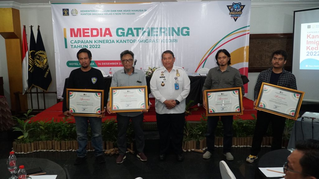 Kepala Kantor Imigrasi Kediri, Erdiansyah, memberikan apresiasi dan penghargaan atas dukungan luar biasa insan pers dan media di Kediri Raya selama tahun 2022. Pemberian penghargaan dilakukan bersamaan dengan Media Gathering yang dilaksanakan di Hotel Merdeka, Rabu (14/12). Apresiasi dan penghargaan ini diberikan kepada organisasi profesi wartawan, meliputi Persatuan Wartawan Indonesia (PWI) yang diterima oleh Ketua [...] Pandemi Covid-19 Mereda, Permohonan Paspor pada Kantor Imigrasi Kediri Meningkat Signifikan