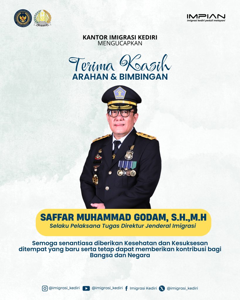 Segenap jajaran Kantor Imigrasi Kediri mengucapkan terima kasih atas arahan dan bimbingan yang telah diberikan oleh Bapak Saffar Muhammad Godam, S.H., M.H. selaku Pelaksana Tugas Direktur Jenderal Imigrasi. Semoga Senantiasa diberikan Kesuksesan dan Kesehatan ditempat yang baru serta tetap dapat memberikan kontribusi bagi Bangsa dan Negara