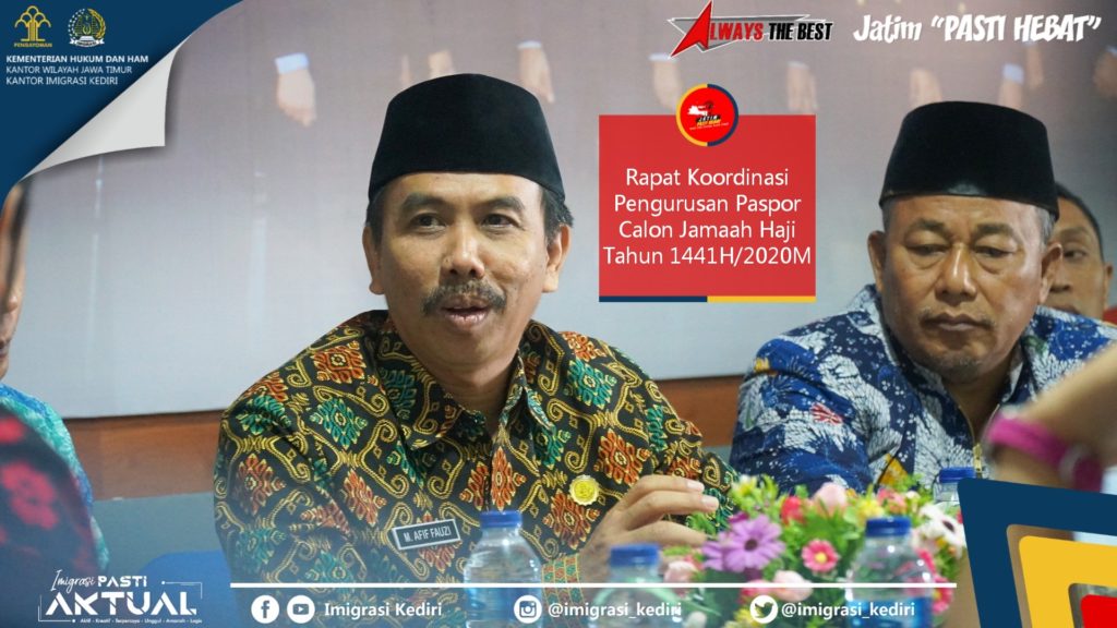 KEDIRI – Jumat (13/12). Pagi ini, perwakilan dari Kementerian Agama empat wilayah (Kota Kediri, Kab Kediri, Kab Nganjuk, Kab Jombang) diundang ke Kantor Imigrasi Kediri untuk berkoordinasi membahas persiapan pengurusan paspor Calon Jamaah Haji Tahun 1441H/2020M. Rapat yang dipimpin langsung oleh Kepala Kantor Imigrasi Kediri, Bapak Rakha Sukma Purnama, ini membahas evaluasi pelaksanaan penerbitan paspor [...] Tim Itjen Kemenkumham RI Hadiri Rapat Progres Pembangunan Gedung Kantor Imigrasi Kediri