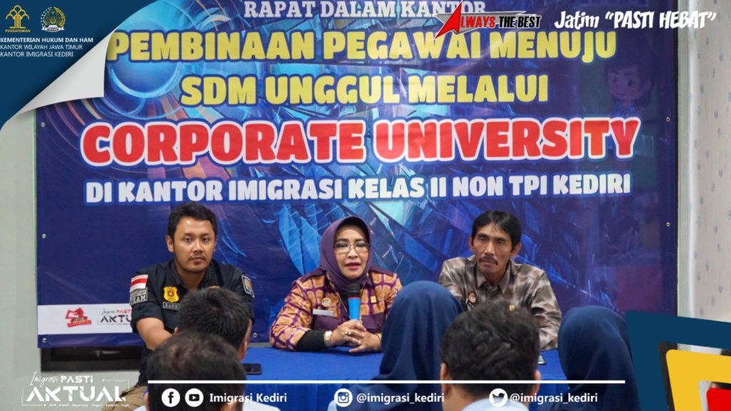Kediri - Kamis (12/12). Hari ini, Kasubsi TI & Inteldakim mengadiri undangan sebagai narasumber dalam Sosialisasi Keimigrasian Mahasiswa Asing dan Job Fair yang diselenggarakan STIKES Bhakti Mulia. Dalam acara yang dihadiri perwakilan 17 lembaga pendidikan di wilayah Kediri beserta para mahasiswa asing ini disampaikan mengenai aturan keimigrasian, prosedur pengurusan visa, hingga tanggungjawab sponsor mahasiswa asing. [...] Corporate University, Pembinaan Pegawai Menuju SDM Unggul