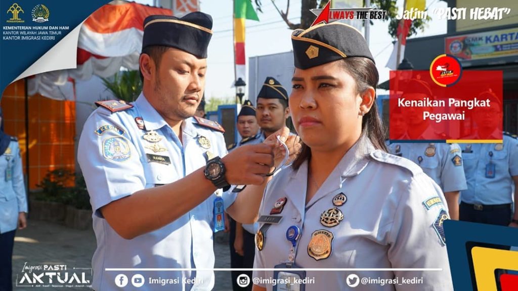 KEDIRI – Senin (12/08). Enam pegawai Kantor Imigrasi Kediri disematkan pangkat baru tanda kenaikan pangkat dan golongan oleh Kepala Kantor, Bapak Rakha Sukma Purnama, hari ini saat Apel Pagi. Dari enam pegawai tersebut; tiga pegawai naik pangkat dan golongan dari Penata muda tk.I (III/b) ke Penata (III/c) sedangkan tiga pegawai lainnya naik pangkat dan golongan […]