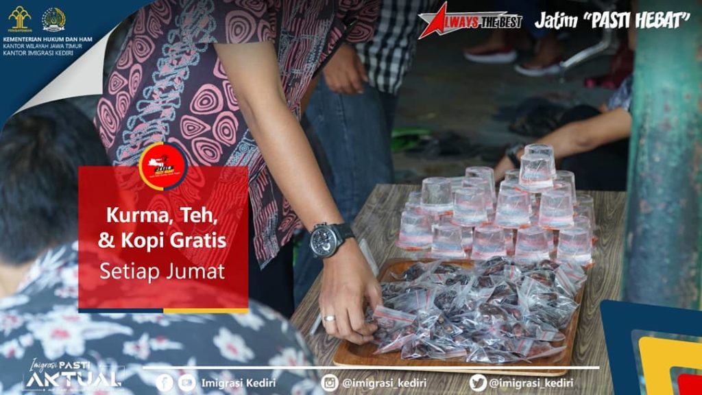 Setiap hari Jumat, Kantor Imigrasi Kediri menyediakan kurma, teh, & kopi gratis. Teh & kopi sudah tersedia sejak pagi di depan loket CS. Sedangkan kurma & air mineral disediakan khusus di depan Mushola Darussalam Kanim Kediri seusai Ibadah Sholat Jumat. Silahkan jangan ragu, bagi pemohon pemohon keimigrasian maupun jamaah Sholat Jumat di Kanim Kediri, untuk […]